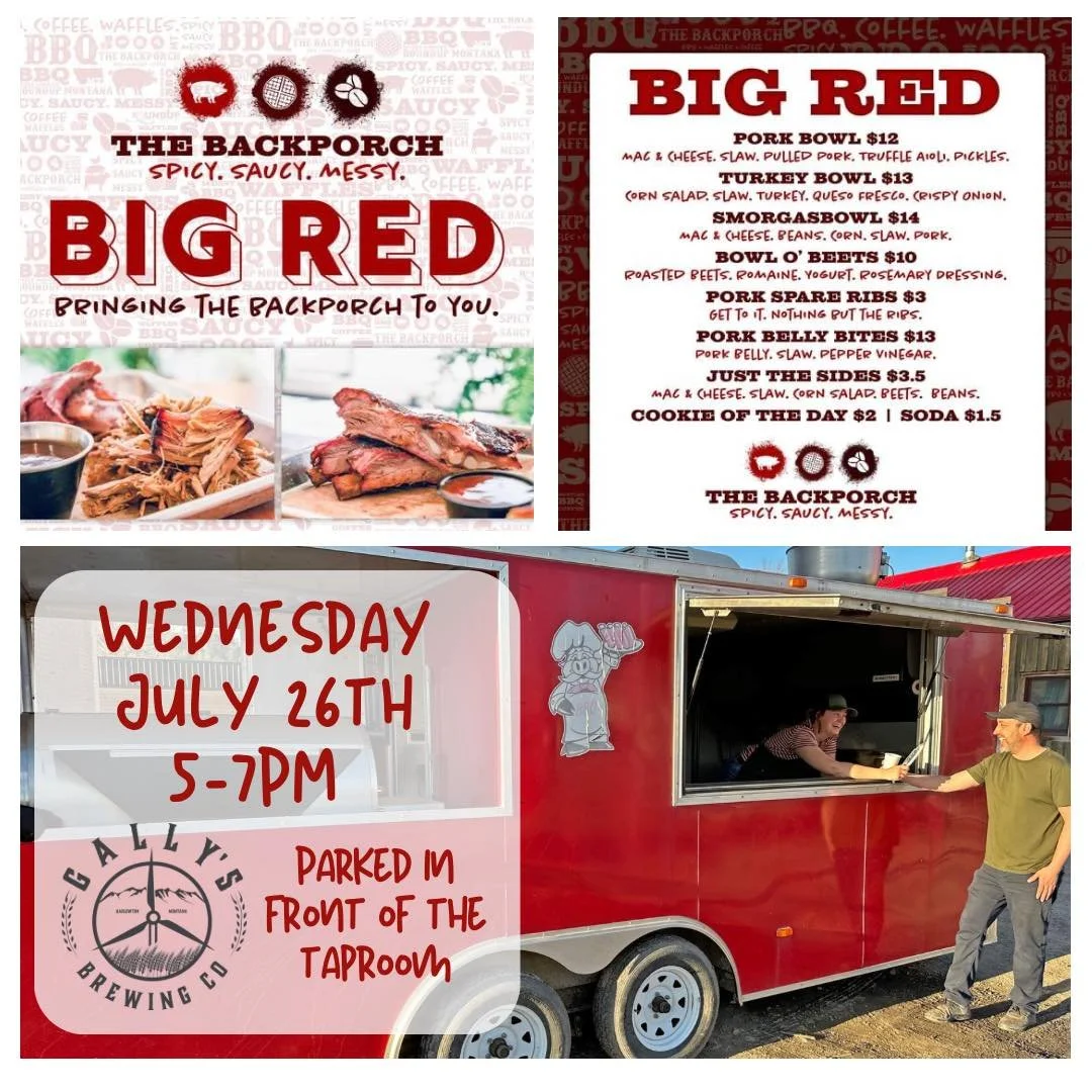 Big Red Food Truck at Gally's Wednesday, July 26, 2023 5:00 PM 7:00 PM Google Calendar ICS The Backporch, Roundup, MT is bringing the Big Red BBQ food truck to Gally’s tomorrow! Come out on Wednesday, July 26th and enjoy some good eats from 5-7PM!