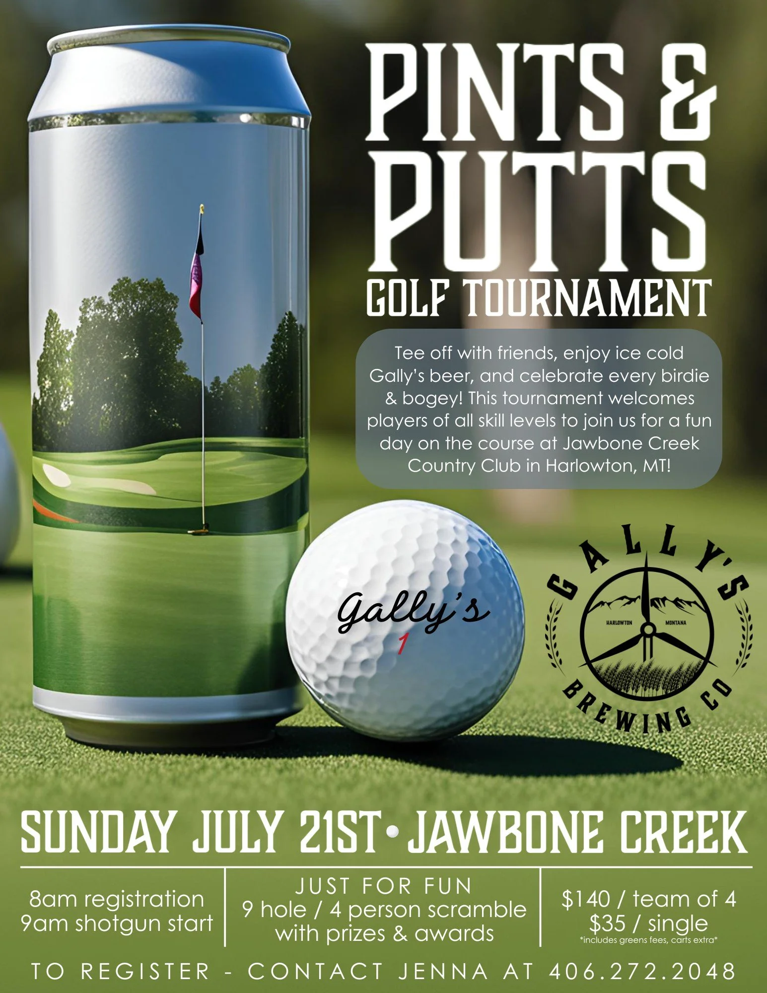 Tee off with friends, enjoy ice cold Gally’s beer, and celebrate every birdie & bogey! This tournament welcomes players of all skill levels to join us for a fun day on the course at Jawbone Creek Country Club in Harlowton, MT for the Pints & Putts golf tournament!